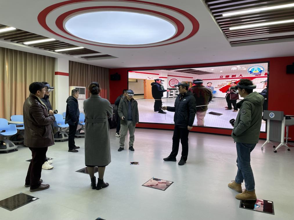 会后,马中东一行参观了学校省级课程思政教学研究示范中心,实地了解我校课程思政信息化教学情况,并饶有兴致体验基于MR技术的沉浸式课程思政学习空间。
